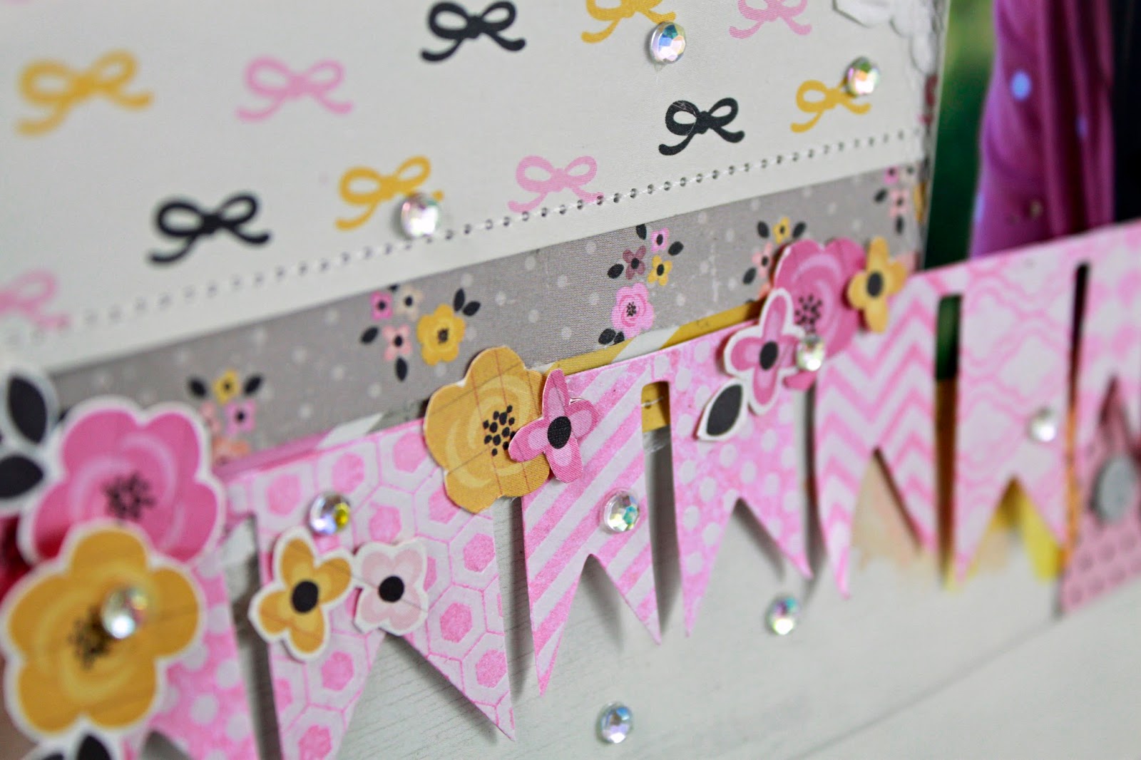 I hand cut 2 bows from the pattern paper and sewed through the transparent letters and thickers.