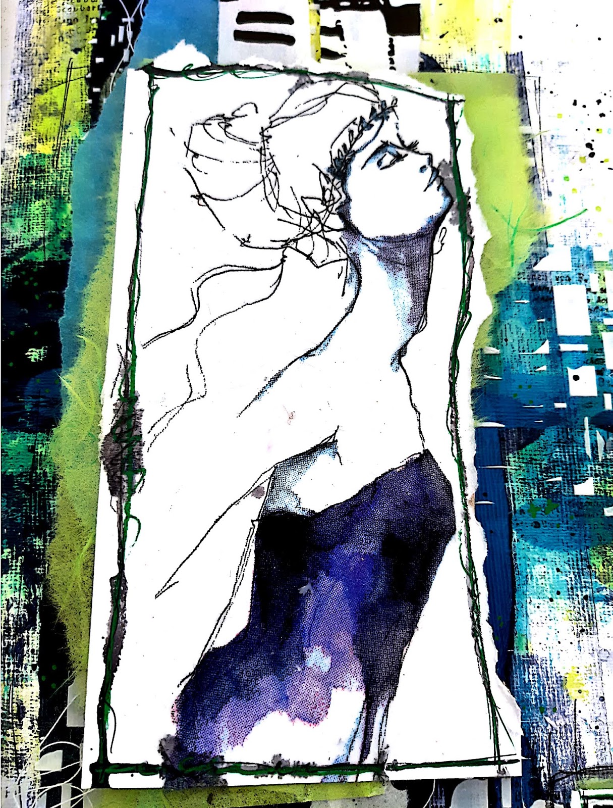 I have mounted the image on top of strips of tissue paper and collage paper. I tore lengthy strips of Dina Wakley Media Collage Tissue Paper then adhered this onto the page over cotton thread from my stash.