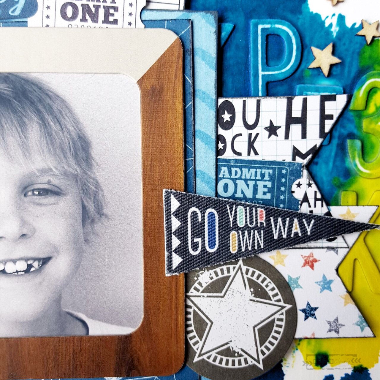 I finished off with a Fabric pennant from Pink Fresh Studio and a Chipboard Frame from Heidi Swapp and some wood veneer stars.