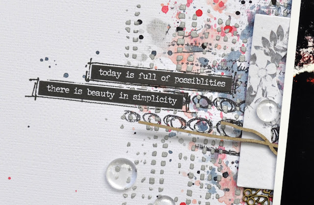 I cut individual pieces out of the Wander sheet and used these as ephemera on the layout. The remainder of the paper was used as solid layers on the layout, using some of the printed word side and then using the reverse side to layer under the words. On these larger pieces I sewed an edge to help define the layers as the papers were quite busy.